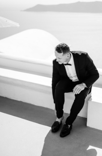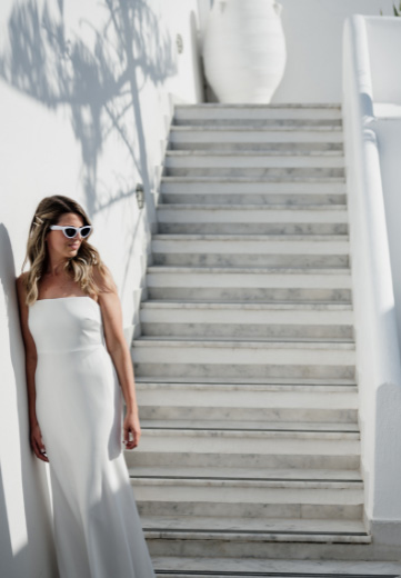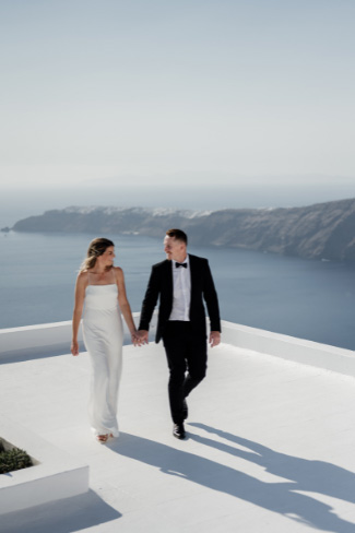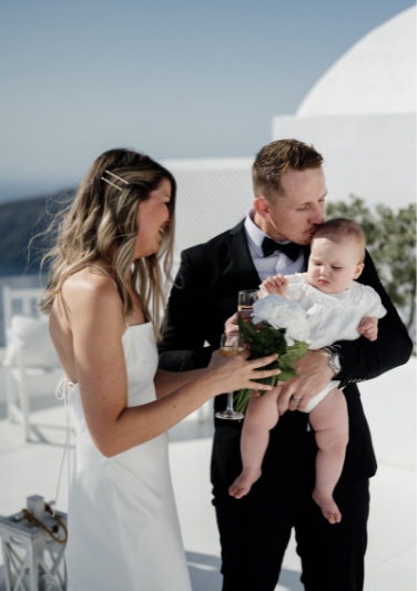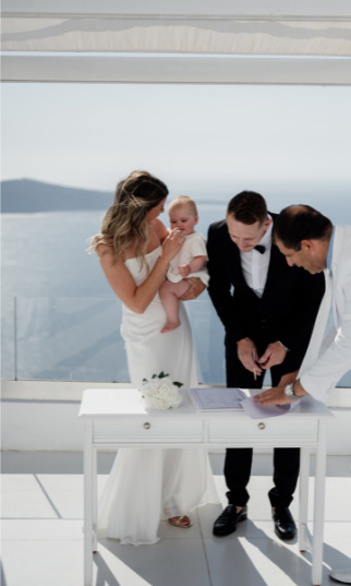 The special guest of the day was their baby girl. She also stole our hearts. Minimal but classic designs were created for this elopement. The beautiful couple said there I dos and then they celebrated their wedding with champagne and a private dinner, discussing their dreams from this day forward with the amazing views and the Santorinian sun. Later, they explored the area for some incredible shots of their big day ending with the beautiful sunset. We are extremely honoured to have met this couple and we wish them a marriage full of love, respect, and devotion.